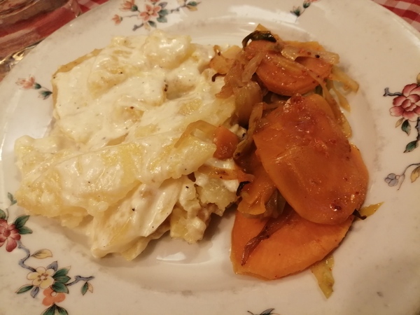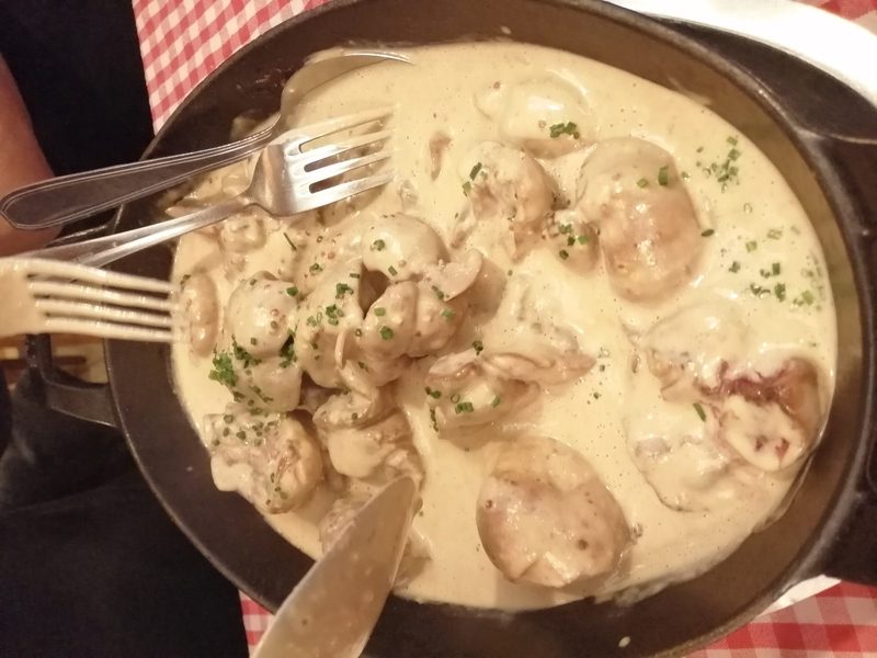 pour les plats : quenelle, rognons à la moutarde, joue de porc, le tout accompagné de gratin dauphinois et carottes