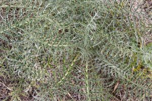 Cette tige principale s’orne de très grandes feuilles, terminées en lobes aigus, profondément marqués, de couleur gris argenté.
